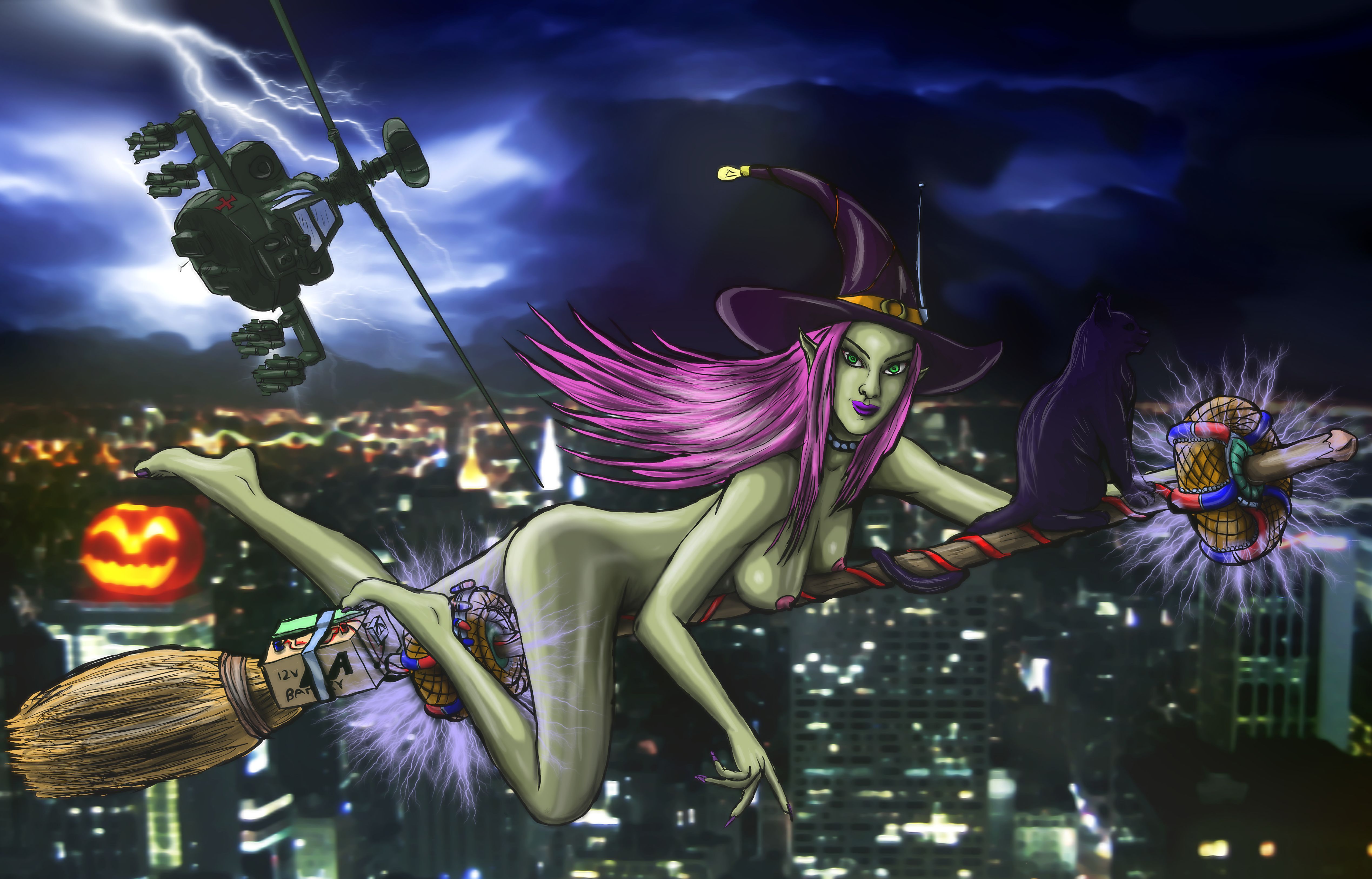 modern/cyber punk witch on an antigravity broomstick... for