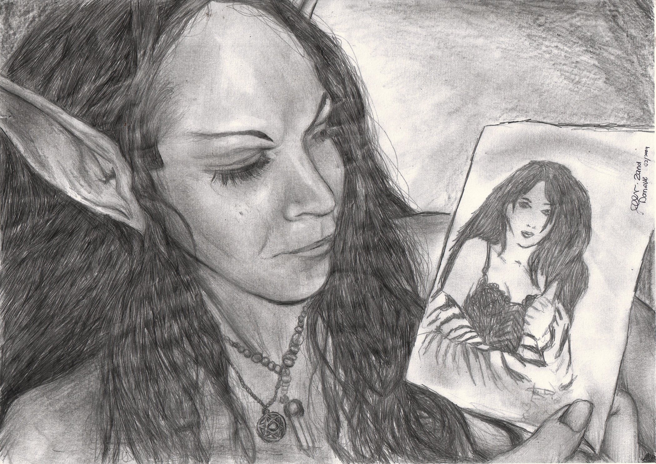 Self Portrait based on this photo of myself... This more experimental pencil work , but isn't as detailed as my elfies (Zana and Zanaria: nature's loving Embrace) one.