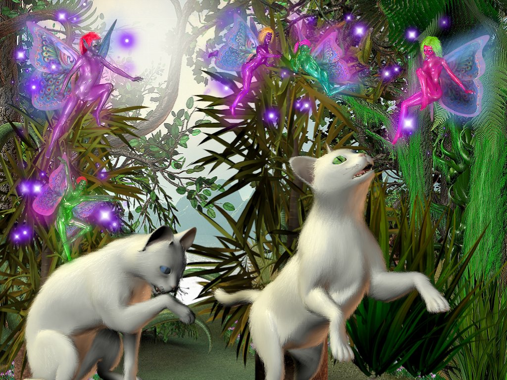 Fun artwork where fairies are teasing cats, the cats based from a neighbour that lived with me when I was a student in Pietermarizburg.