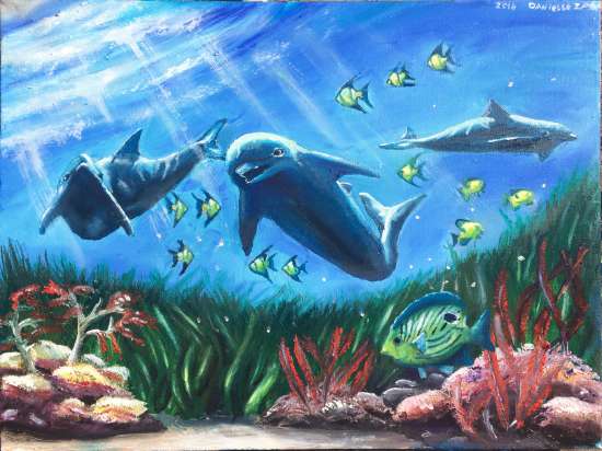 Oils on canvas, gift art for my cousin Linda Wright, of dolphins in an underwater scene.