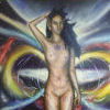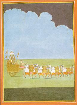 artwork, depicts Krishna travelling in a vehicle that looks like