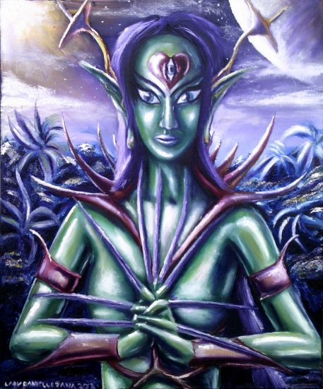 Greetings from an extraterrestrial who's home orbits a gas giant planet, which orbits around a red dwarf star, with blue leaved plants, oils on canvas.