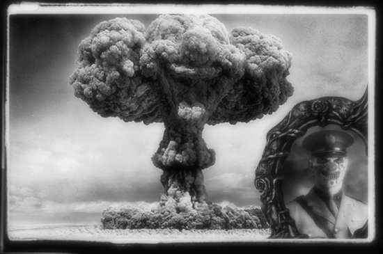 A funny photo manipulation of a Military dude clown and his clown faced Nuclear Bomb, as a protest against the stupidity of nuclear weapons.